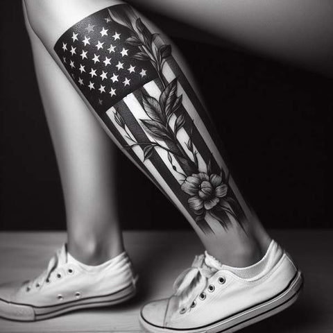 A floral American flag tattoo blends the flag’s iconic design with delicate flowers, creating a unique and feminine aesthetic. This style is perfect for those who want a softer, more artistic interpretation of the flag.