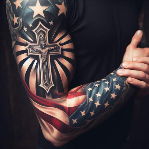 A cross paired with the American flag is a popular design among those who want to symbolize their faith and patriotism. This tattoo often represents sacrifice, honor, and devotion, making it a meaningful choice for veterans, active-duty military personnel, or anyone who holds these values close to their heart.