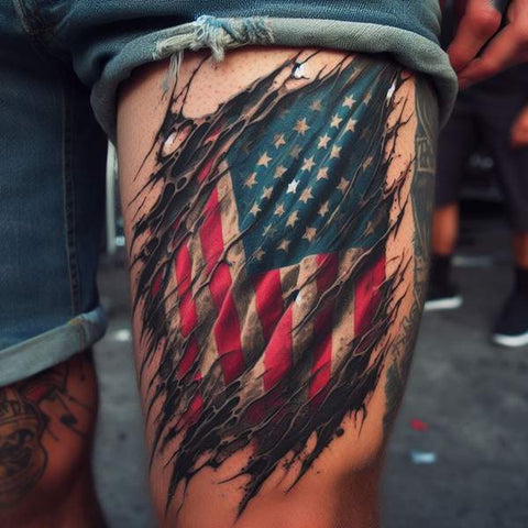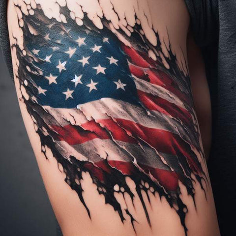 Similar to the ripped flag design, a tattered American flag tattoo symbolizes endurance and strength. This style often incorporates elements like wind or fire to create a dramatic and impactful design.