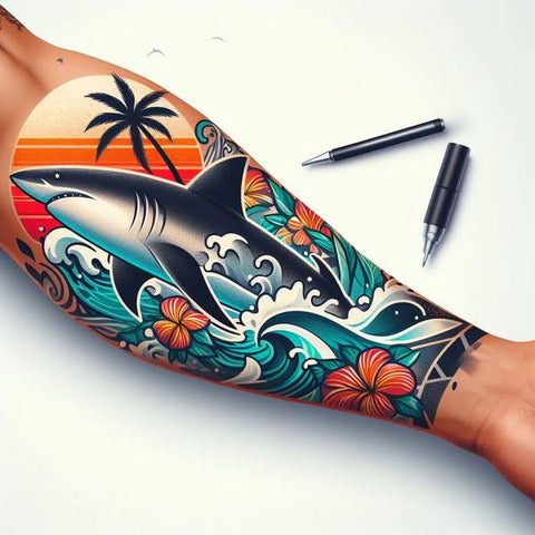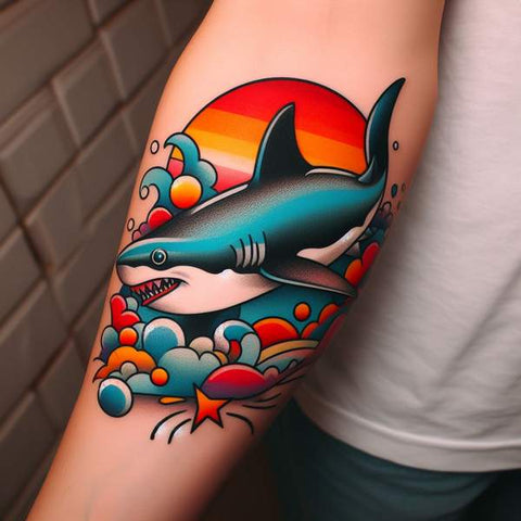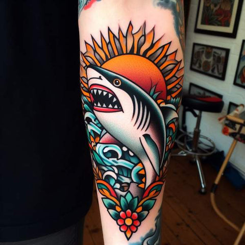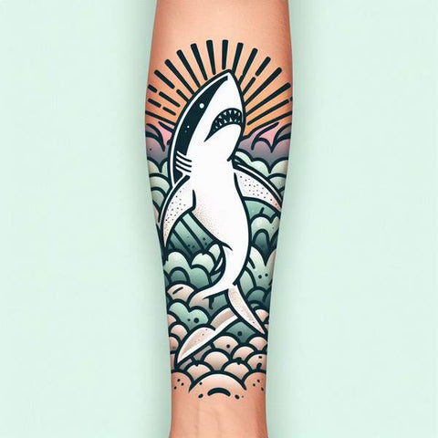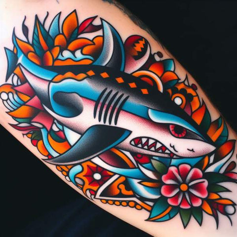 Inspired by classic American tattoo art, an American traditional shark tattoo features bold lines, vibrant colors, and a timeless aesthetic. This design symbolizes strength, courage, and a rebellious spirit, making it a popular choice for those who appreciate vintage tattoo styles.