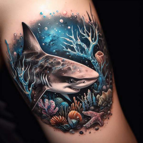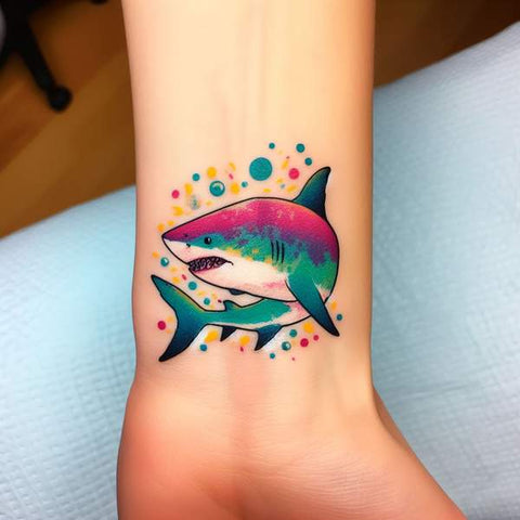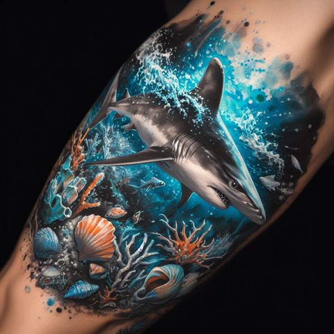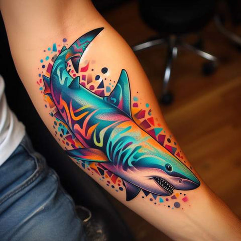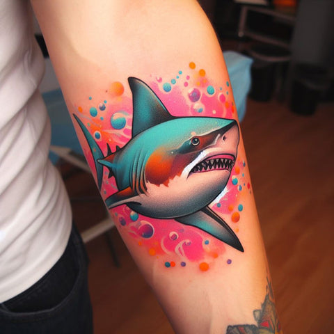 A watercolor shark tattoo features soft, flowing colors and a painterly style. It symbolizes the wearer’s creativity and their ability to blend strength with artistry. This design is ideal for those who want a tattoo that is both bold and beautiful.
