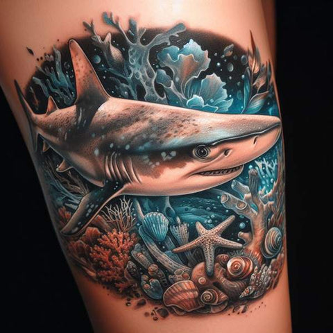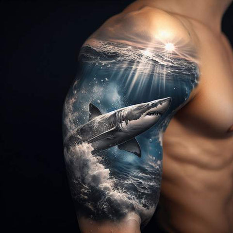 A realistic shark tattoo captures the intricate details and lifelike appearance of a shark. It symbolizes the wearer’s appreciation for the raw power and beauty of these majestic creatures. This design is perfect for those who want a tattoo that feels alive and dynamic.
